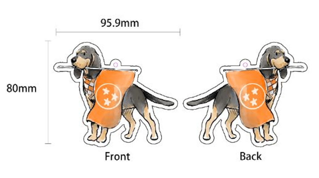 Celebrate your Tennessee pride with this unique Bluetick Coonhound air freshener. Featuring a spirited Bluetick Coonhound carrying the iconic orange Tennessee Tristar flag, this air freshener brings a perfect blend of Tennessee pride to any space. Ideal for homes, offices, cars, or cabinets, it adds a burst of Southern spirit and a touch of rustic charm wherever it’s placed.