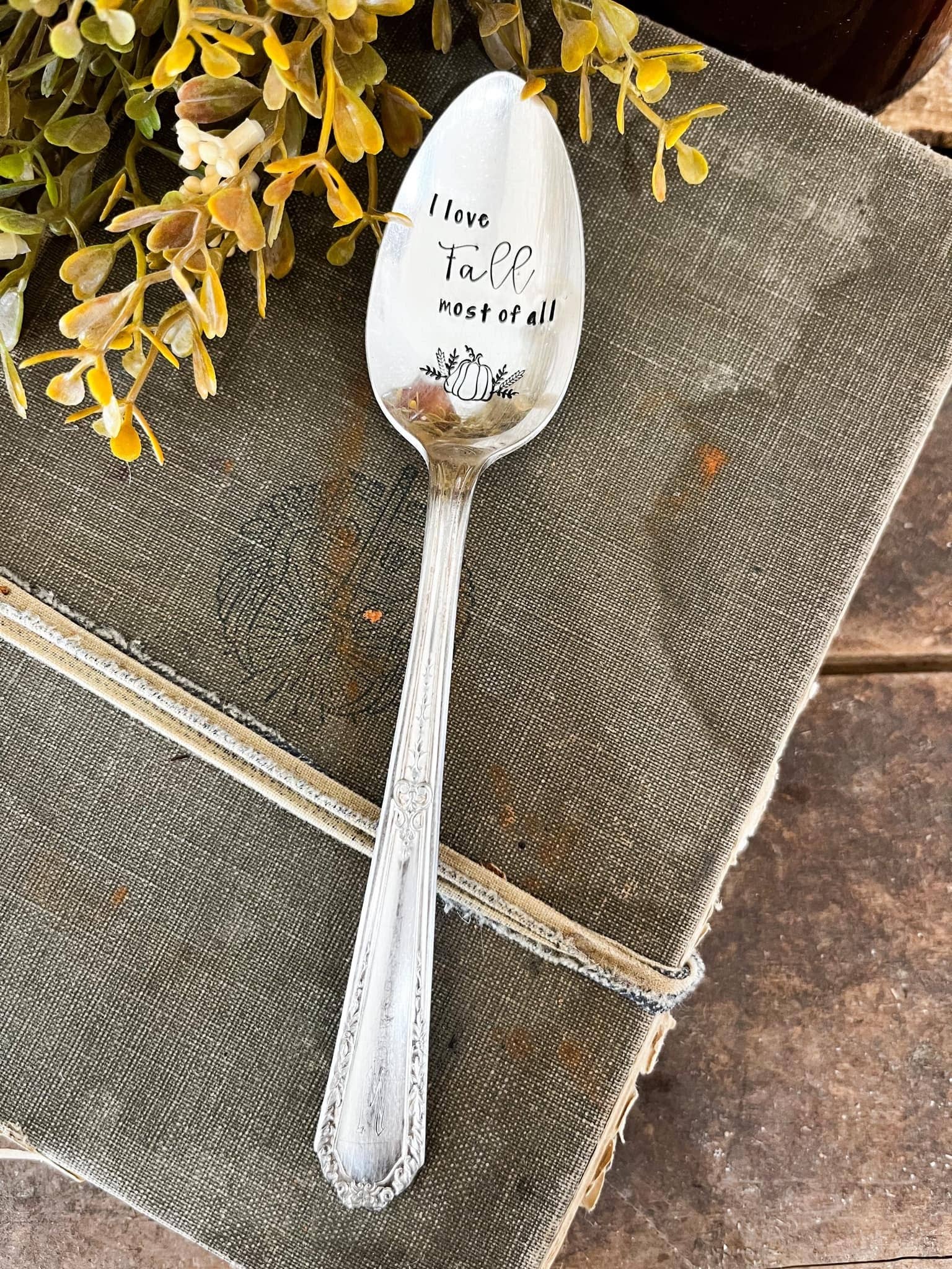 This is for ONE spoon with the saying “fall leaves & autumn breeze” with leaves.