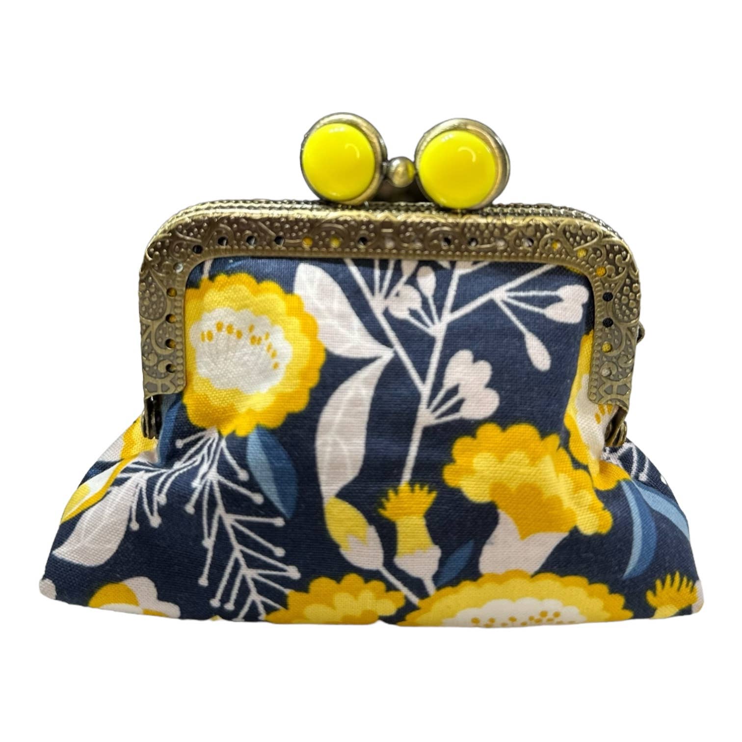 Spice up your purse collection with this Kiki & Syds super cute mini clutch purse. Handmade with high quality 100% cotton fabric. Each clutch is fully lined with coordinating fabric and adorned with a beautiful velvet logo tag. The purse frame measures 3.54" W x 2.36" H. This gorgeous ancient bronze embossed lace metal frame has a kiss clasp lock with lotus head semi-circular beads. The finished bag at its widest part measures 4.5"W x 3.25 H.