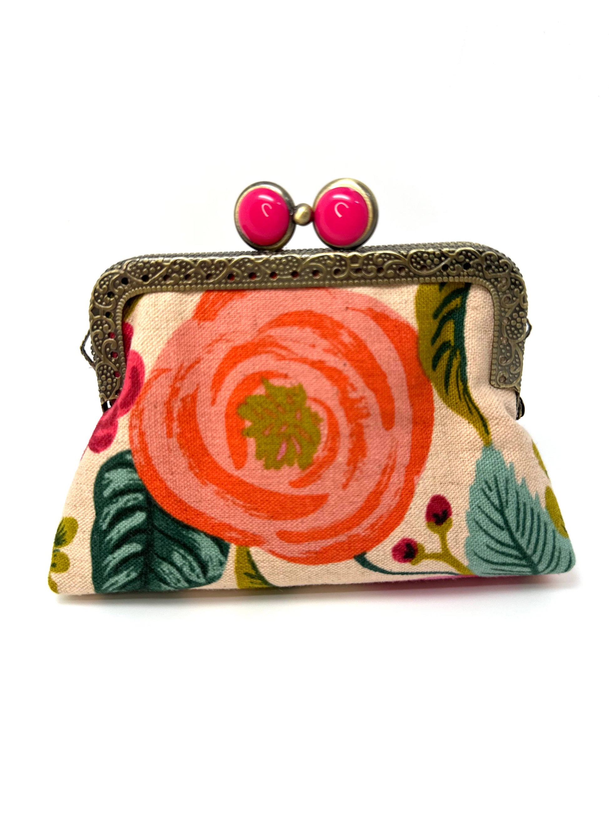 The Kiki & Syds ON-THE-GO credit card clutch is the perfect companion while you’re out and about. Handmade with high quality 100% cotton fabric by Rifle Paper Co., and fully lined with coordinating fabric. The purse frame measures 4.14" W x 2.36" H. This gorgeous ancient bronze embossed lace metal frame has a kiss clasp lock with lotus head semi-circular beads. The finished bag at its widest part measures 5.25"W x 4”H X 1.5”D.