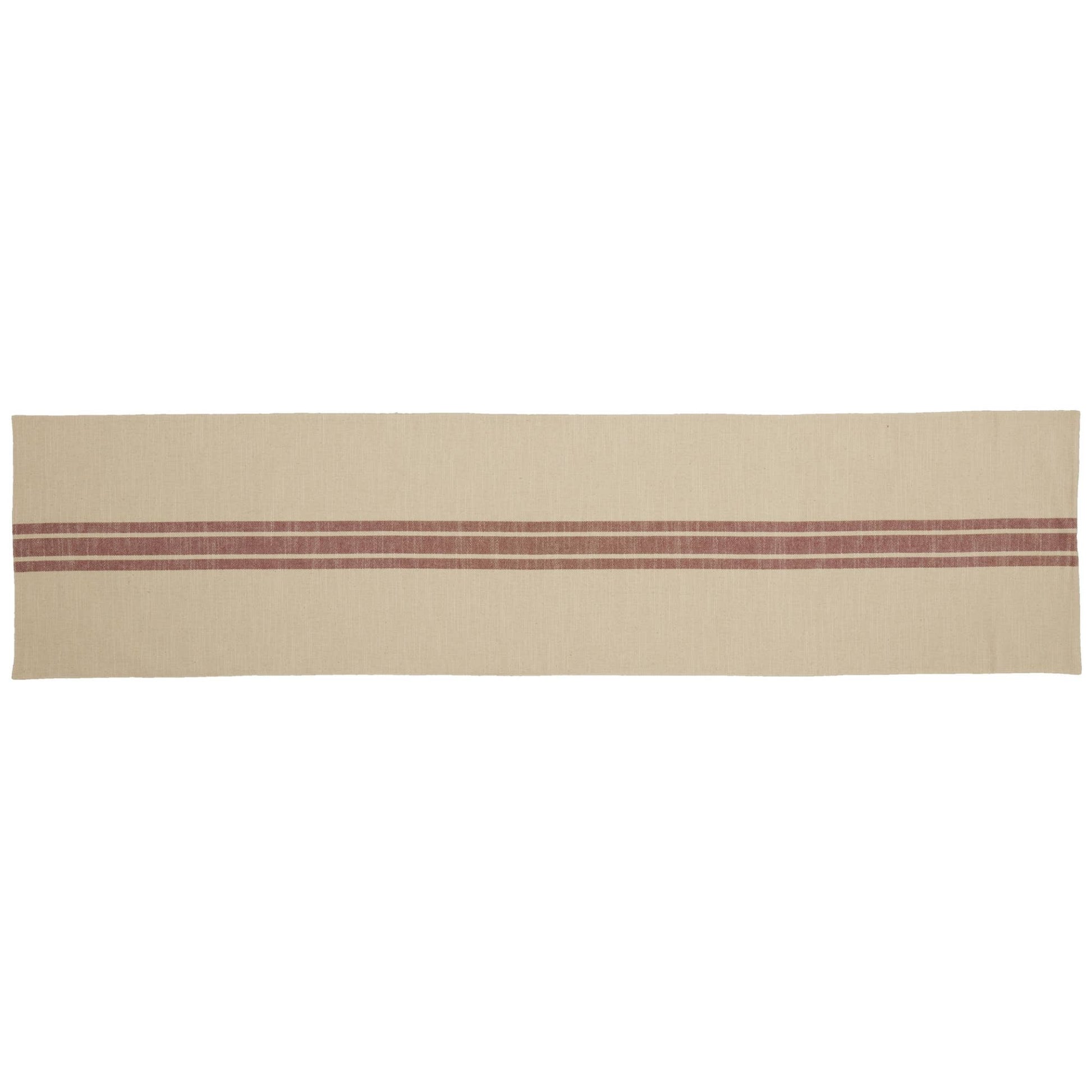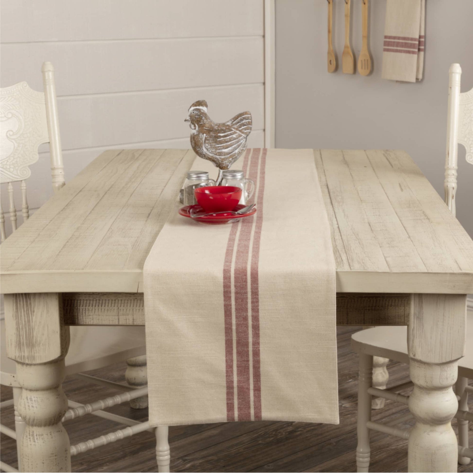 We LOVE stripes and grain sack fabrics and we know that you do too! When we combined grain sack fabric with wide ticking stripes in our Market Place Collection, our most popular and timeless farmhouse styles. We've been hearing for some time now that many of you would like to see the Market Place in a true farmhouse red. Well, here it is, and we just know you're going to love it! For this collection, we chose a beautifully textured, substantial weight cotton with a surprisingly soft hand feel. One set of broad woven stripes in muted brick red run down the center of the runner, and make a delightful contrast against the natural cream base. The table runner measures 13 x 54 and reverses to a soft cream cotton. Includes: 1 x Table Runner Care Instructions: Machine Wash, Tumble Dry Low, Iron Safe Material: 100% Cotton Shell, Cotton Flannel Batting